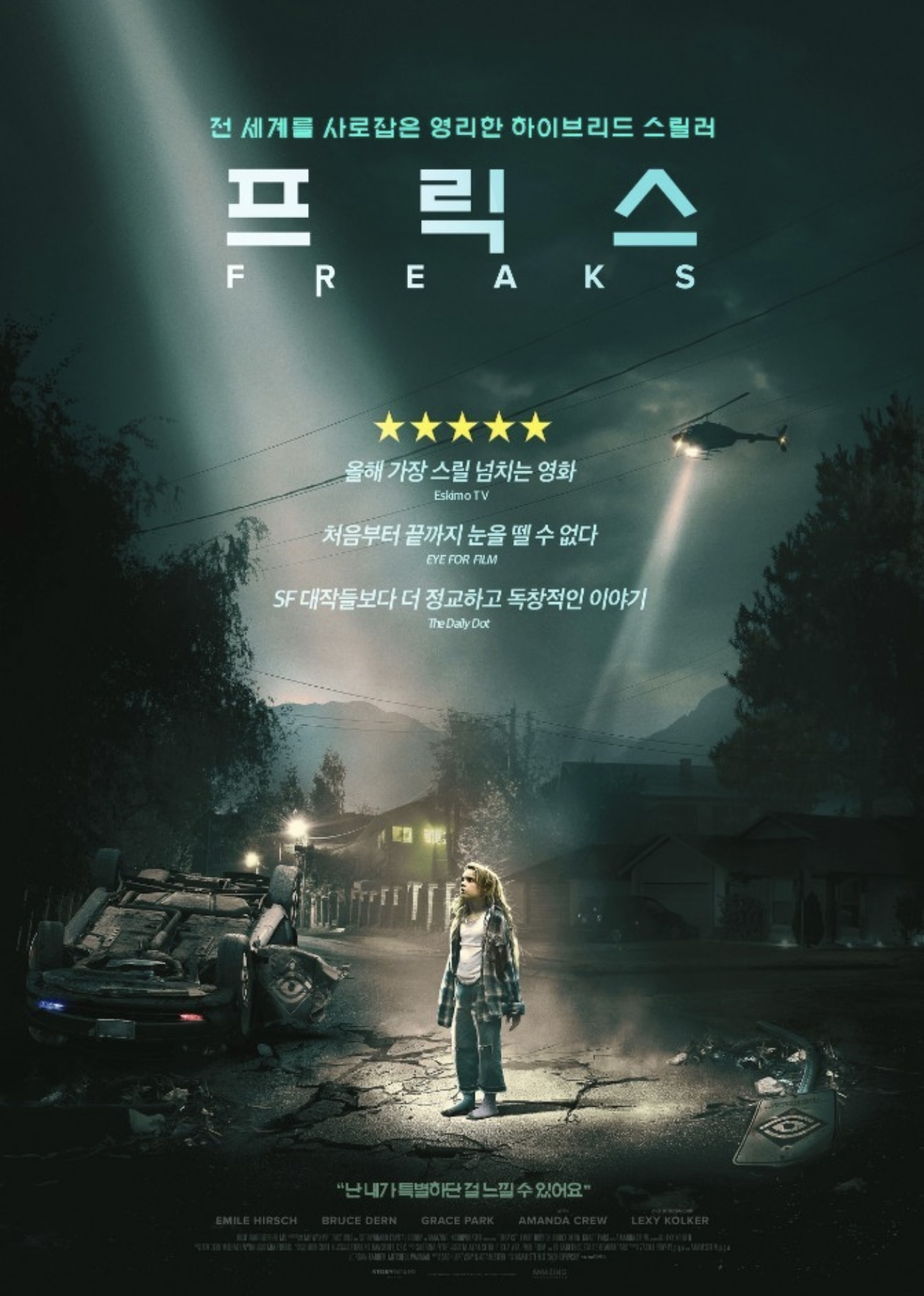 영화 '프릭스(Freaks)'는 잭 립스키와 애덤 B. 스타인 감독이 공동 연출한 SF 스릴러이자 가족 드라마로, 초능력을 지닌 사람들과 그들을 두려워하는 사회의 갈등을 그린 작품입니다. '크로니클', '루시', '로건'과 같은 초능력 영화들이 주로 거대한 액션과 특수효과로 승부했다면, '프릭스'는 인간의 감정과 심리, 그리고 격리된 공간 속의 긴장감에 초점을 맞춘 작품입니다.